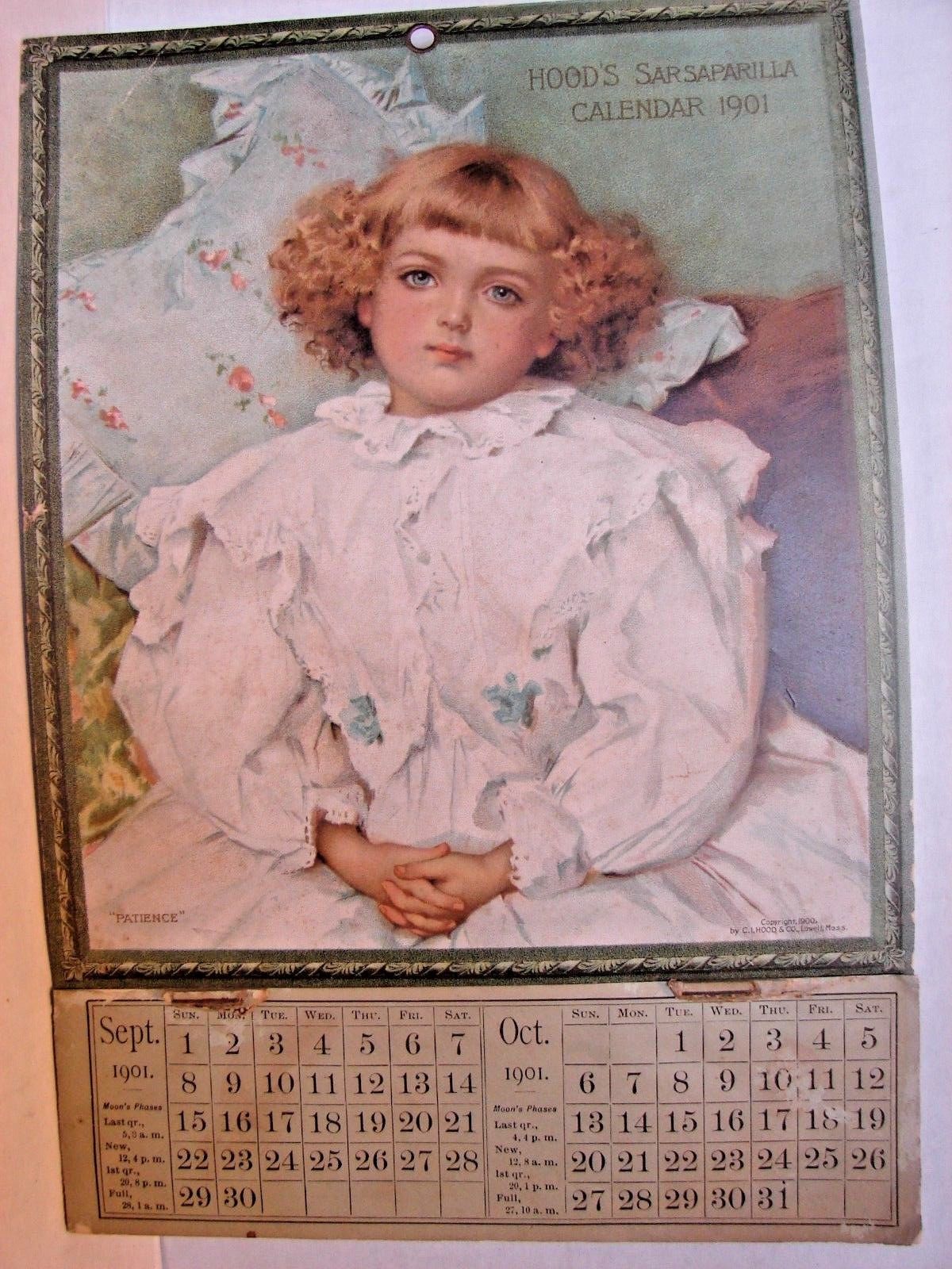 Title (ebay affiliate link): Original Antique 1901 HOODS SARSAPARILLA CALENDAR Young Girl PATIENCE Pictured