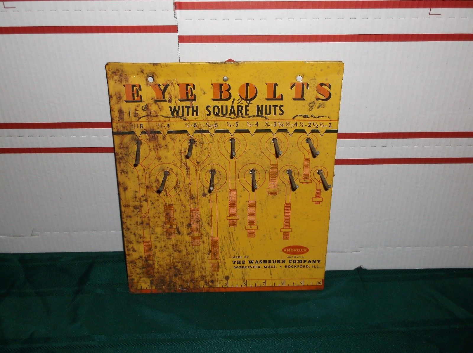 Title (ebay affiliate link): VINTAGE EYE BOLTS W/ SQUARE NUTS METAL ADVERTISING SIGN / DISPLAY WASHBURN CO.