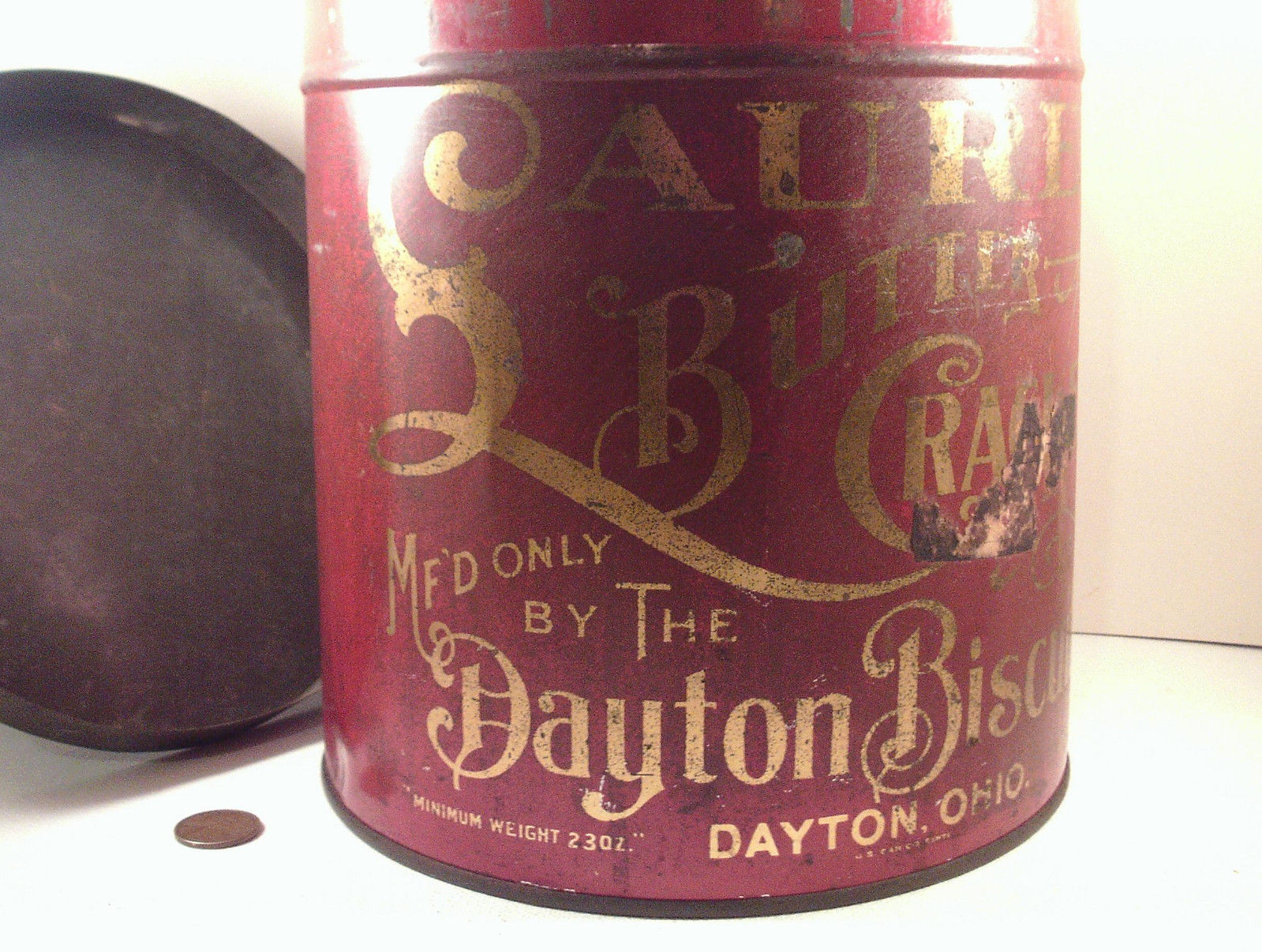 Original-vintage Antique (TIN LITHO) Dayton Bisquit Co "SAUREL CRACKER" Tin Can!