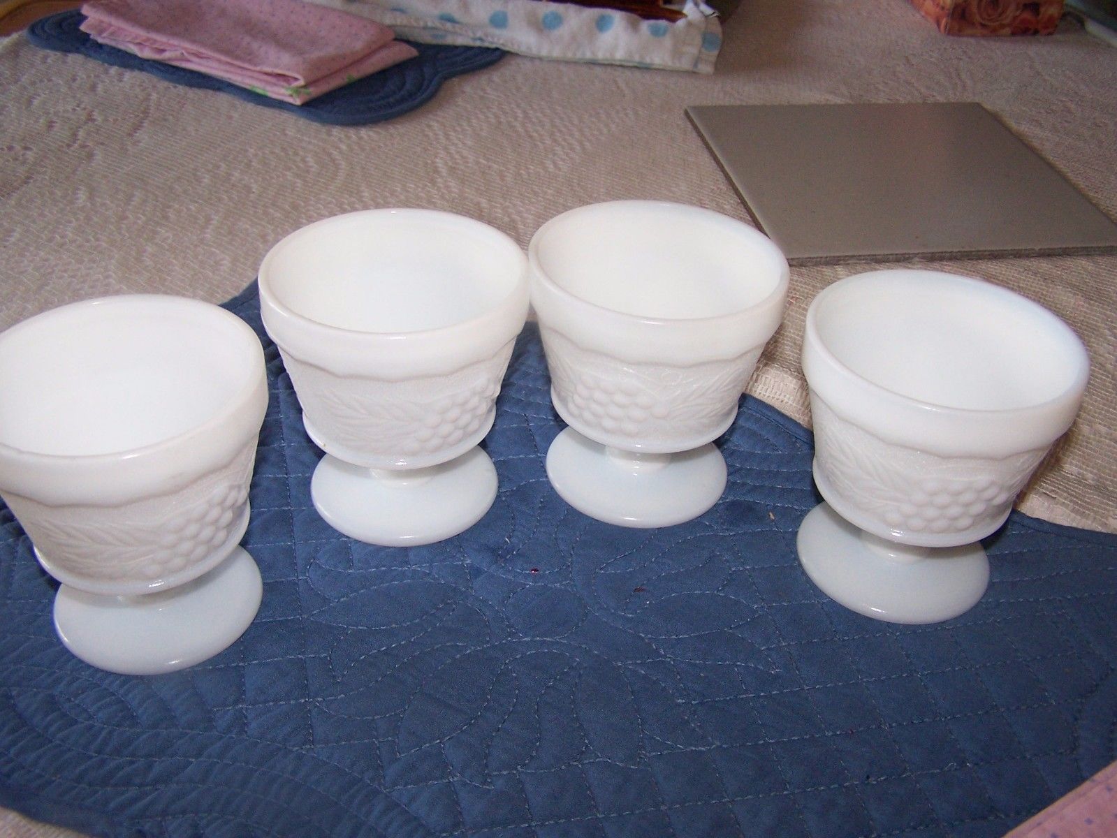 Title (ebay affiliate link): White Milk Glass Grape Pedestal Sherbert Dish Cup Stemmed Anchor Hocking Set 4
