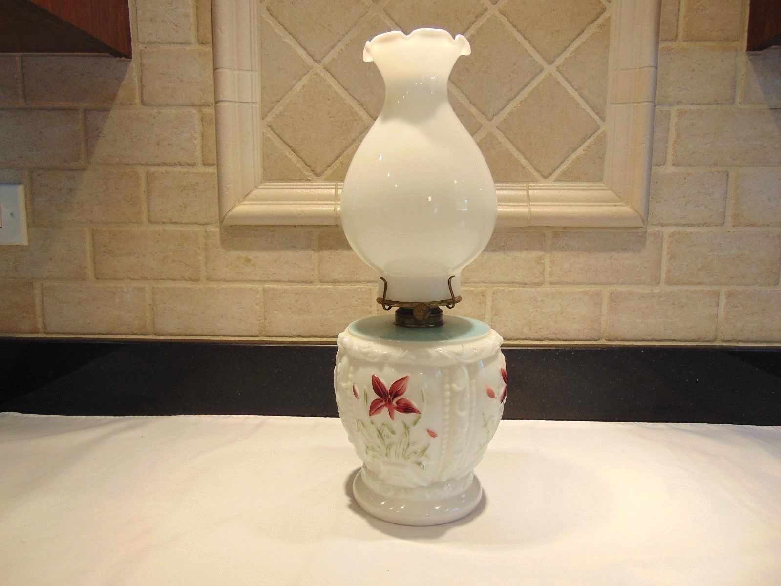 Title (ebay affiliate link): Vintage P&A Manufacturing Co Hand Painted Milk Glass Oil Lamp
