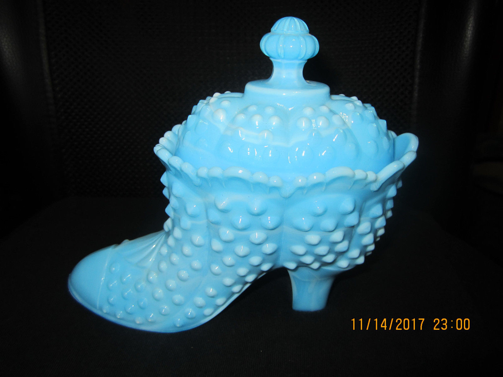 Title (ebay affiliate link): Vintage Fenton Blue Slag Milk Glass Covered Hobnail Shoe/Boot Candy Dish