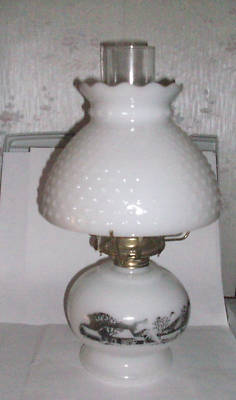 JEANNETTE WHITE MILK GLASS OIL LAMP Currier Ives nobox