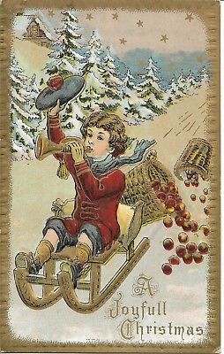 Title (ebay affiliate link): Vintage Christmas Postcard Boy Blowing Horn and Sledding 1907-1915