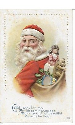 Vintage Christmas Postcard Santa Looking Over Shoulder at Sack of Toys 1917