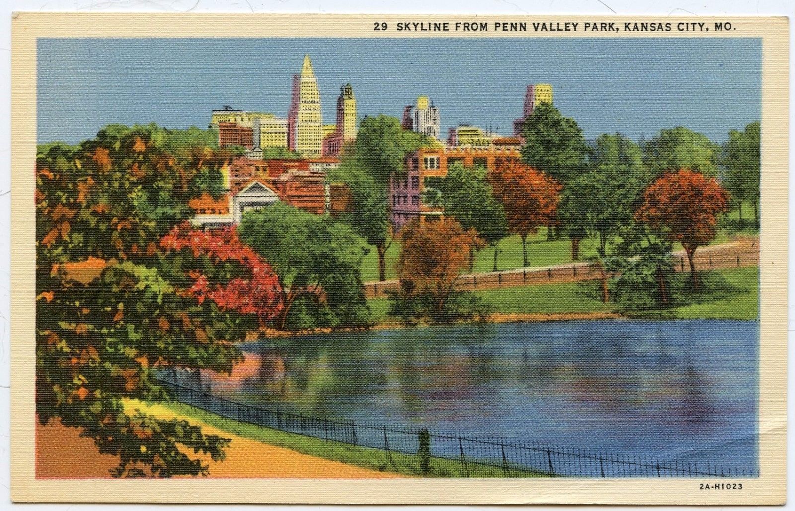 Title (ebay affiliate link): B7361 Skyline from Penn Valley Park Kansas City MO 1932 Linen PC Teich 2A-H1023
