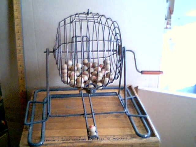 Wire Church BINGO Cage Bakelite Handle antique vintage old wood balls game toy