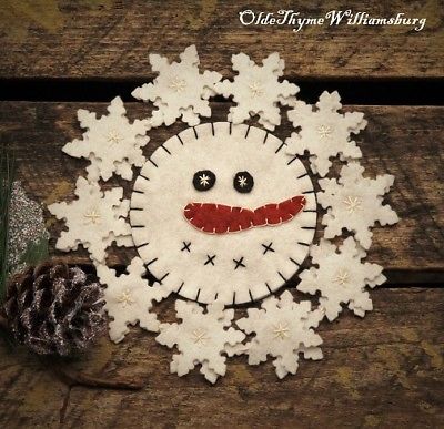 Title (ebay affiliate link): Primitive Stitchery CHRISTMAS Snowman Snowflakes Penny Rug ~ Winter Candle Mat