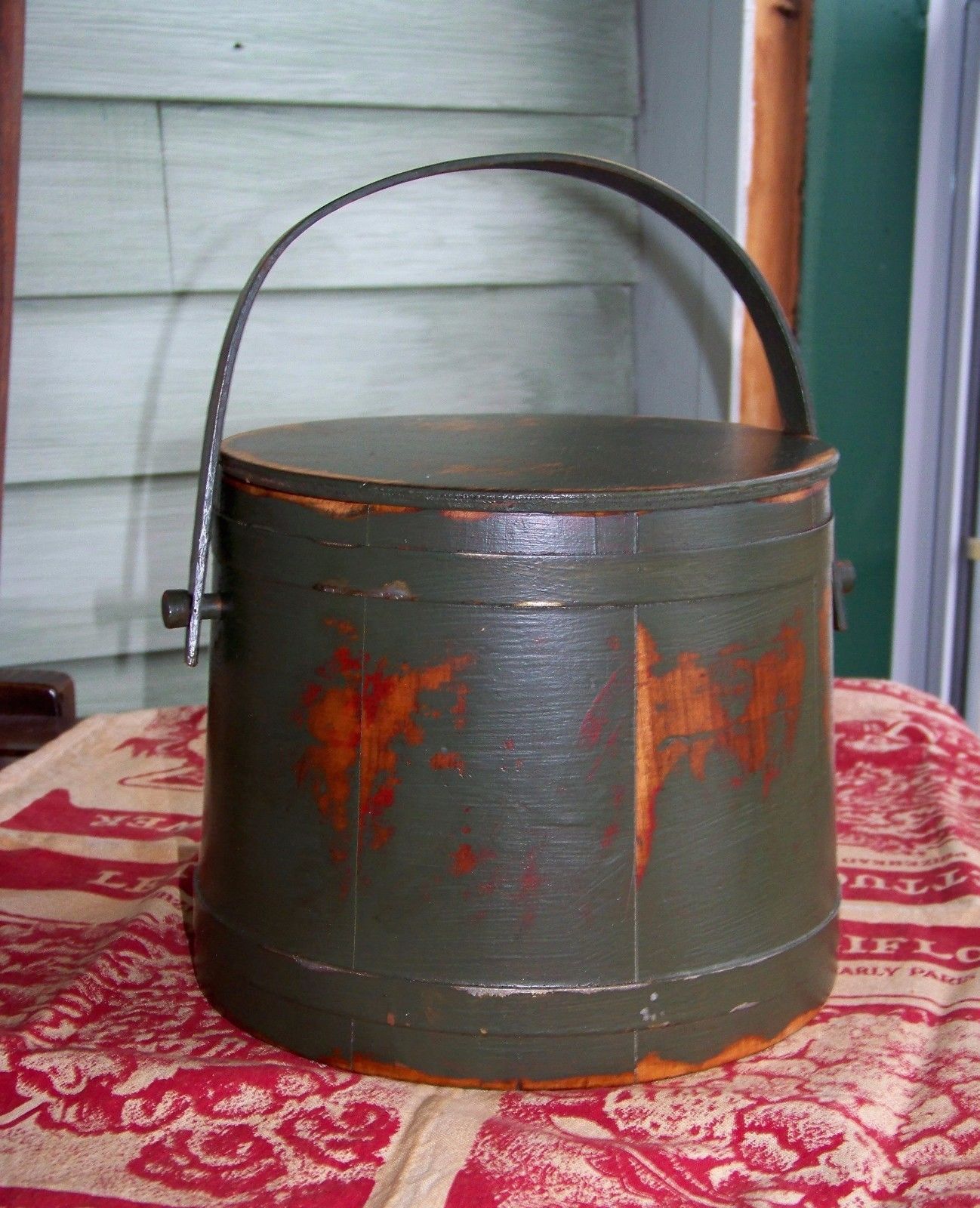 Title (ebay affiliate link): Primitive Vintage Green Painted Firkin Sugar Bucket Metal Bands Swing Handle