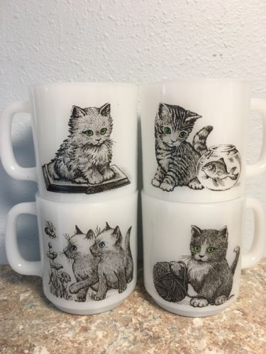 Title (ebay affiliate link): Adorable Green & Blue Eyed Kitten Retro VTG Glasbake Milk Glass Cups Set/4 MINTY