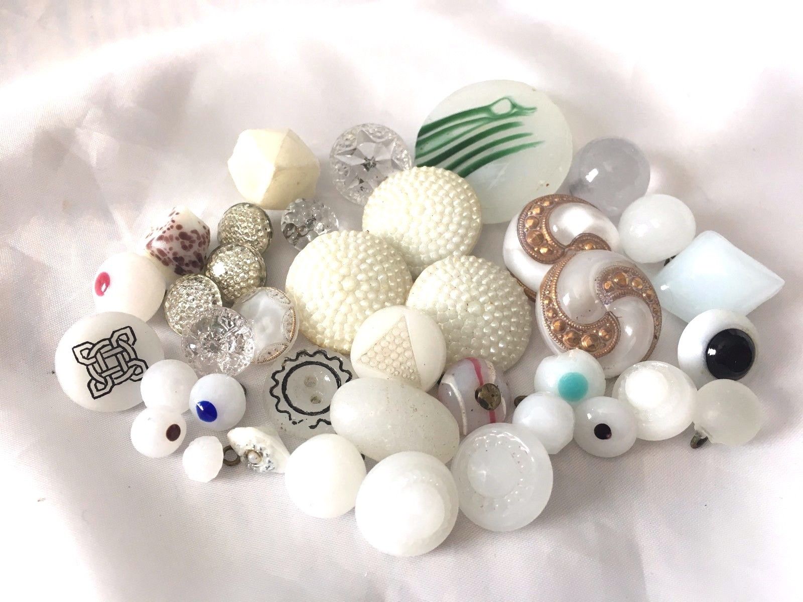 Title (ebay affiliate link): Lot of 37 Vintage Glass Buttons Clambroth Milk Glass Sets Swirl Back Moonglow