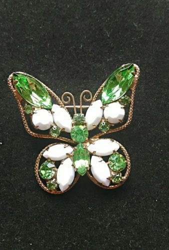 Title (ebay affiliate link): Lovely vintage milk glass green Navette Round Rhinestone Butterfly Brooch