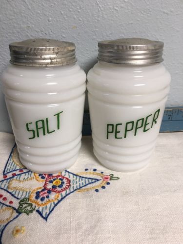 Title (ebay affiliate link): Vintage Hazel Atlas Milk Glass With Green Print Salt & Pepper Shakers!! Awesome!