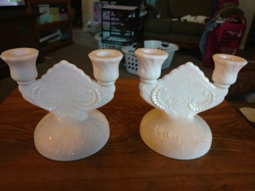 Title (ebay affiliate link): Jeannette Shell Pink Milk Glass Double Candle Holders Set of Two .... Beautiful!