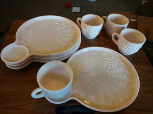 Title (ebay affiliate link): 4 SETS VINTAGE JEANETTE SHELL PINK MILK GLASS SNACK PLATES W/MATCHING TEA CUPS !