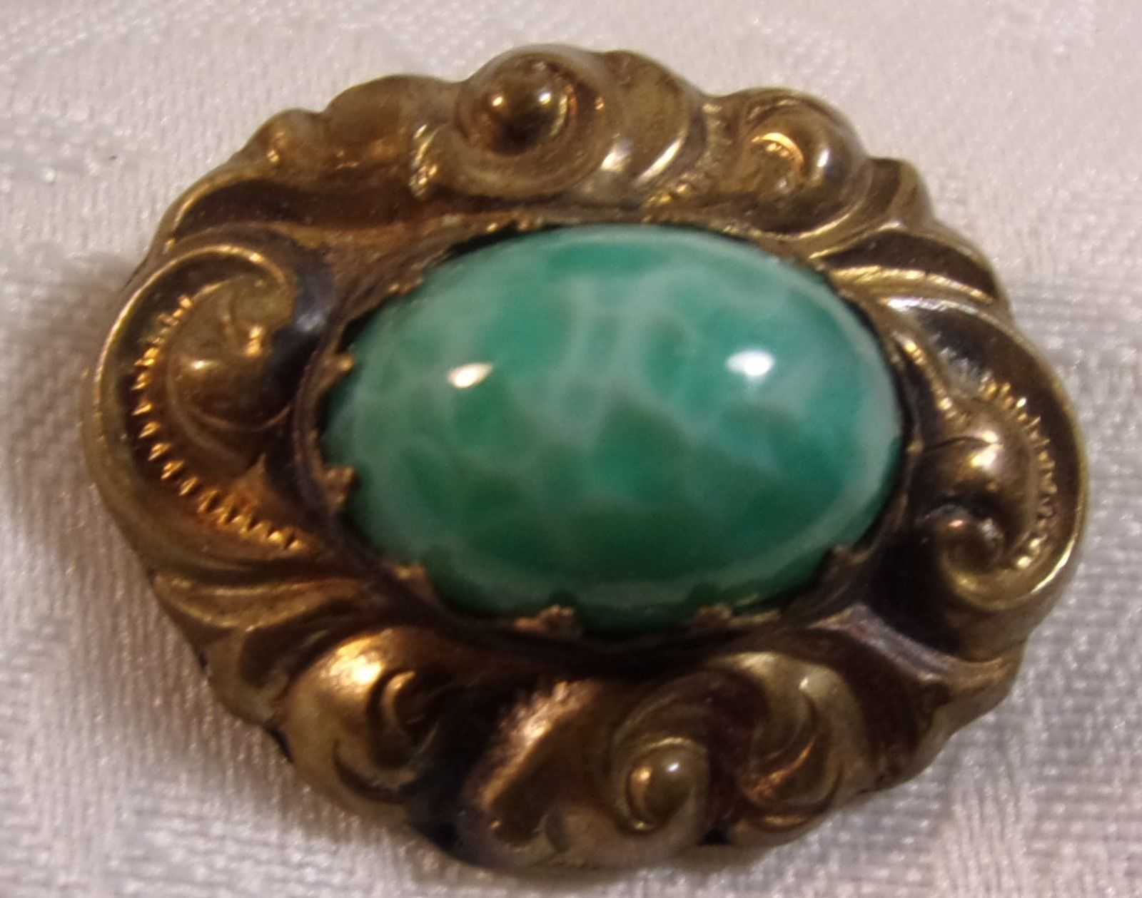 Title (ebay affiliate link): Antique Victorian Jade Milk Glass Cabachon Gold Plated Pin/Brooch Lovely 1890