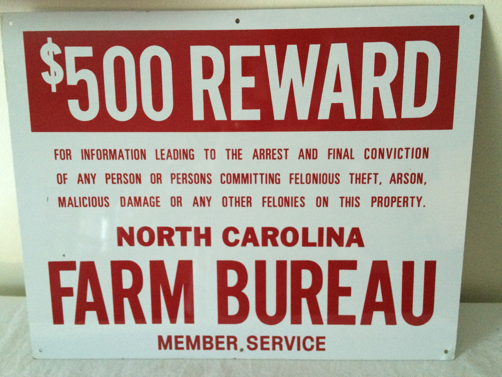 Farm Bureau Member Service North Carolina NC $500 Reward Property Metal Sign