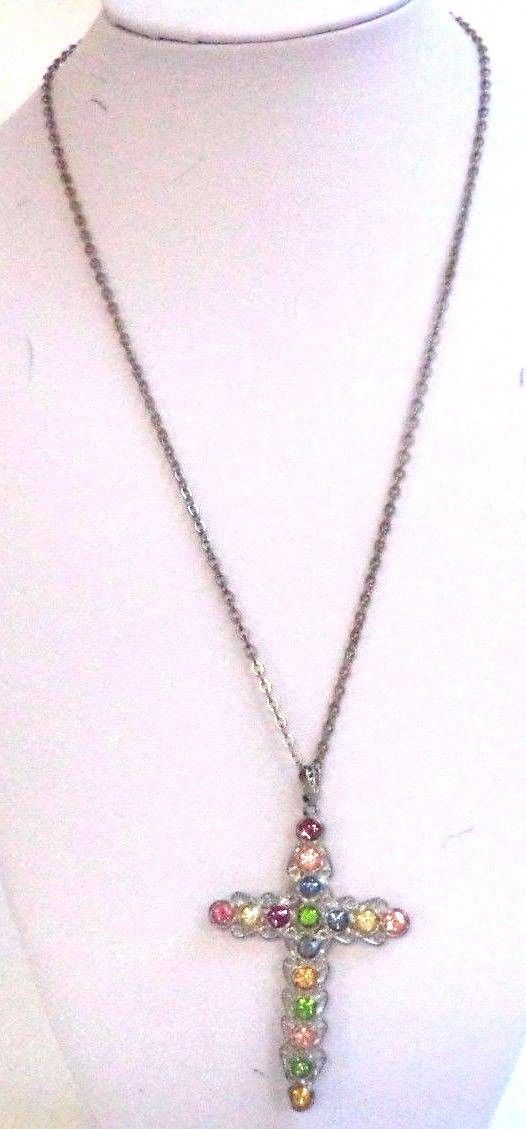 STUNNING ANTIQUE ESTATE FRUIT SALAD CROSS JESUS SILVER TONE 28" NECKLACE!! 8094E