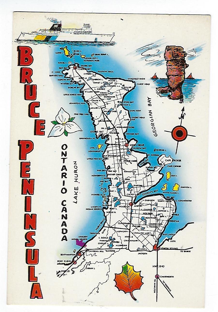 Title (ebay affiliate link): Map of Bruce Peninsula - Ontario, Canada - Vintage Postcard