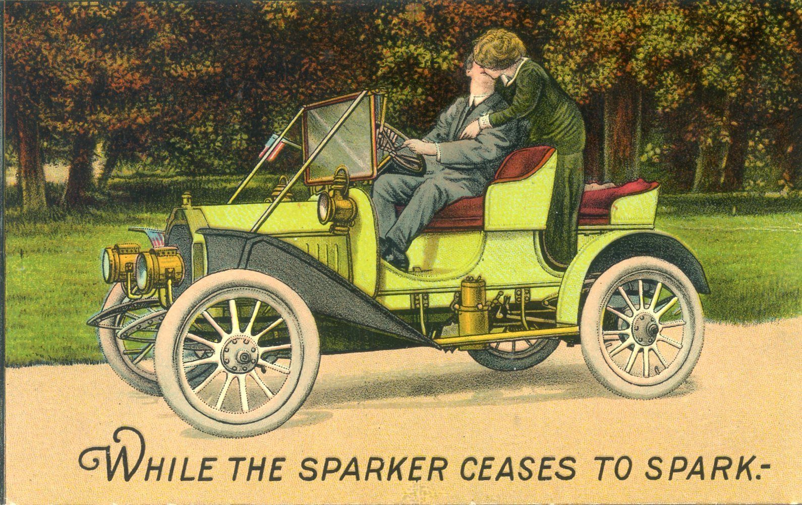 Title (ebay affiliate link): Vintage 1910''s Automobile Romance postcard, "While the Sparker ceases to Spark"