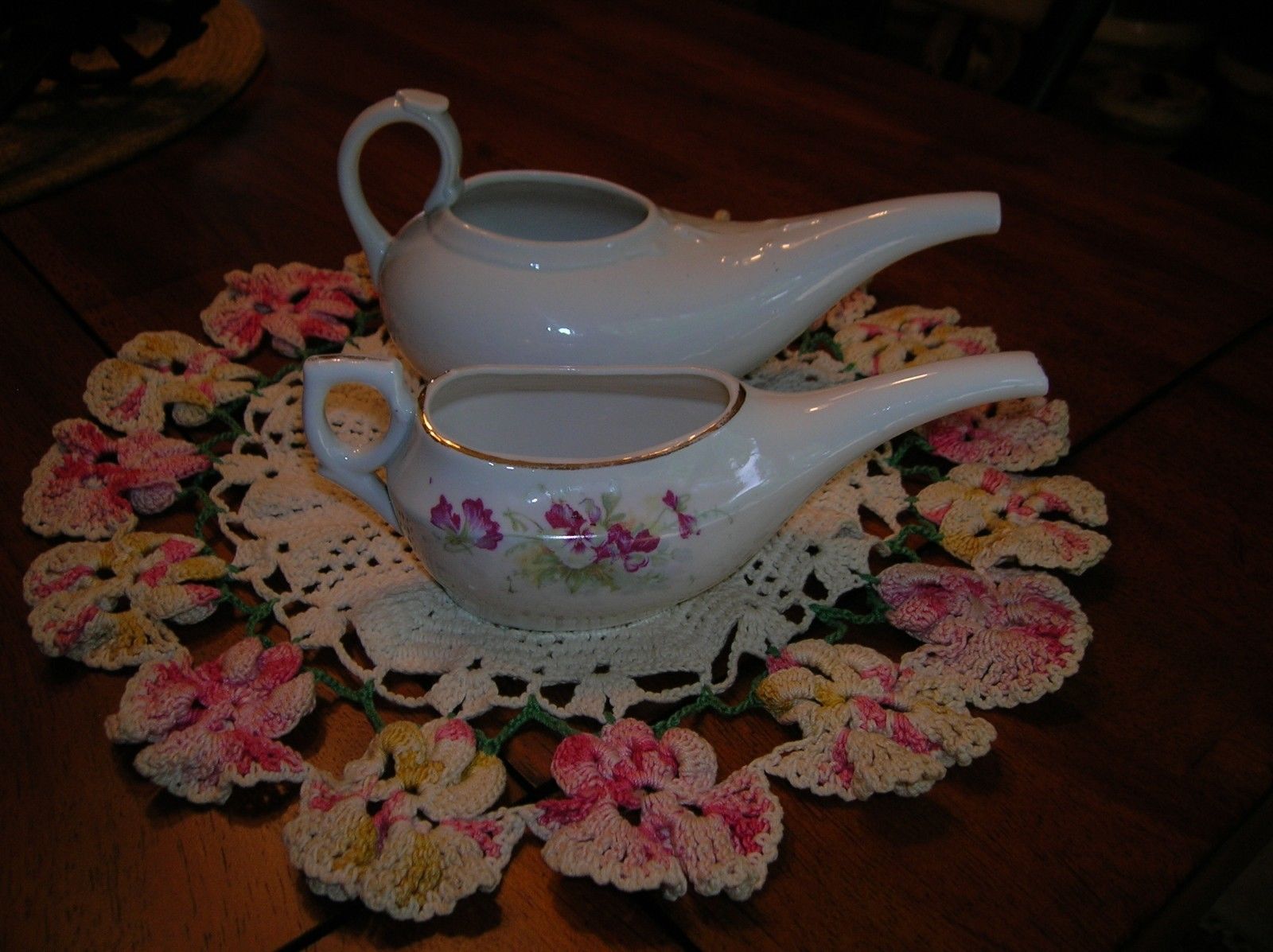 Title (ebay affiliate link): 2 ANTIQUE PORCELAIN MEDICINE INVALID INFANT FEEDERS FLOWERS GOLD 7" & 6 1/4"