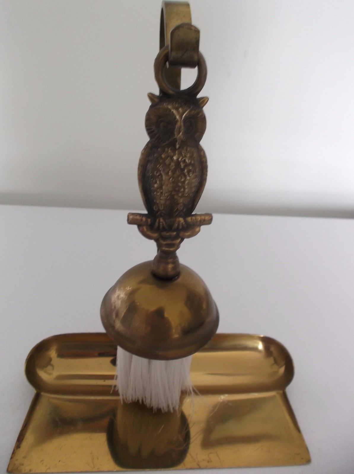 VINTAGE OWL BRASS CRUMB TRAY AND BRUSH, MADE IN ENGLAND