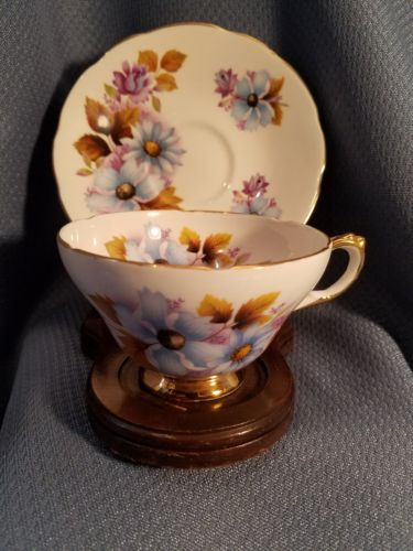 antique porcelain tea cup saucer set Royal Sutherland England blue fall bouquet