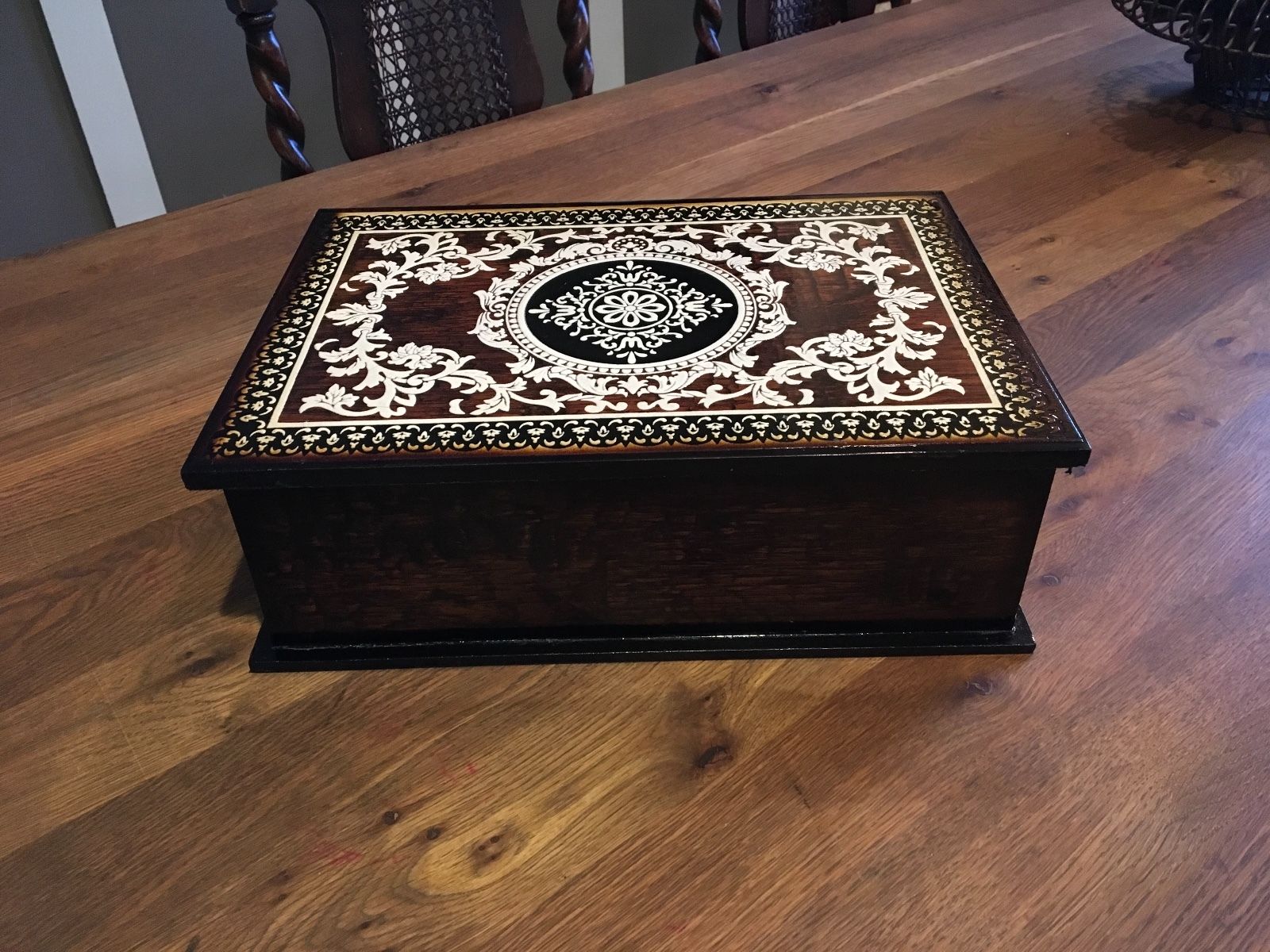 Large Wood Hinged Dresser/Jewelry Box Carved & Hand Painted Design on Lid
