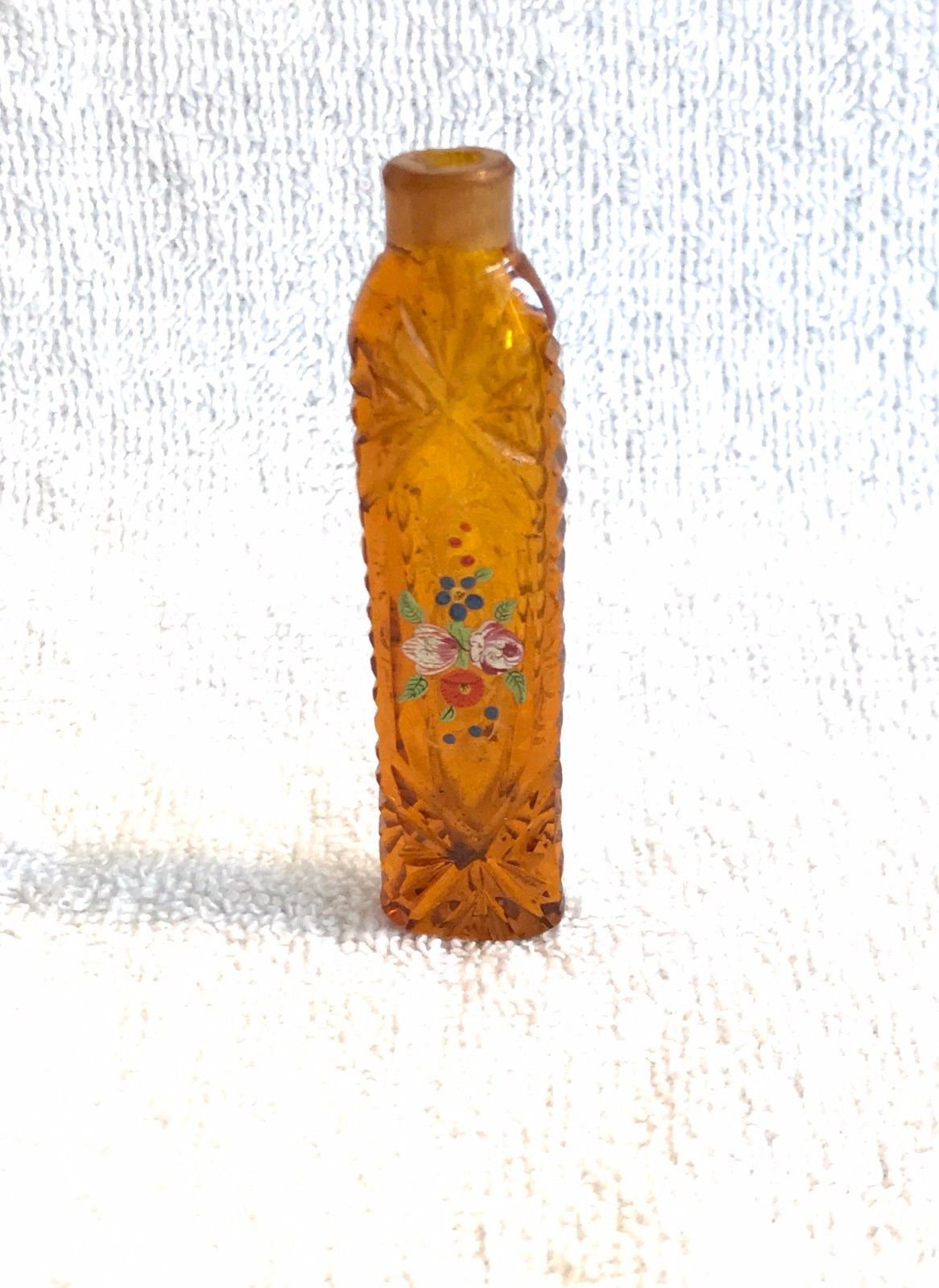 Title (ebay affiliate link): VINTAGE ANTIQUE AMBER GLASS PERFUME SCENT BOTTLE FLORAL HAND PAINTED 3" X .75"