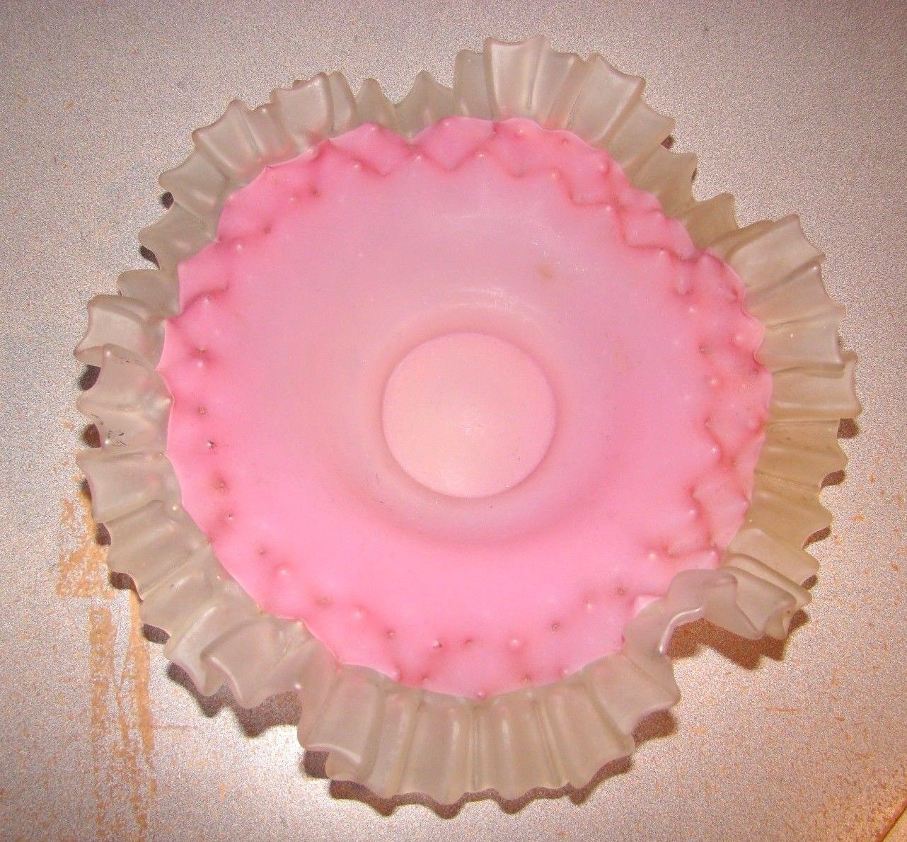 Title (ebay affiliate link): Victorian Pink Satin Glass w/ Clear Frosted Ribbon Edge Brides Bowl