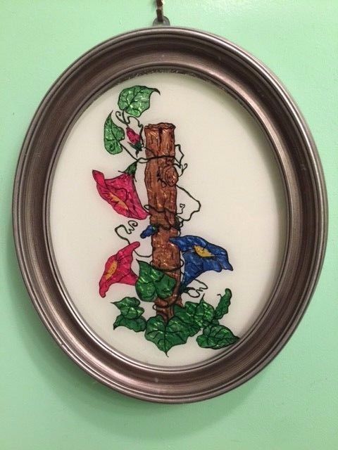 Title (ebay affiliate link): Vintage Art Reverse Glass Painting Picture Foil Tinsel Morning Glory Flowers