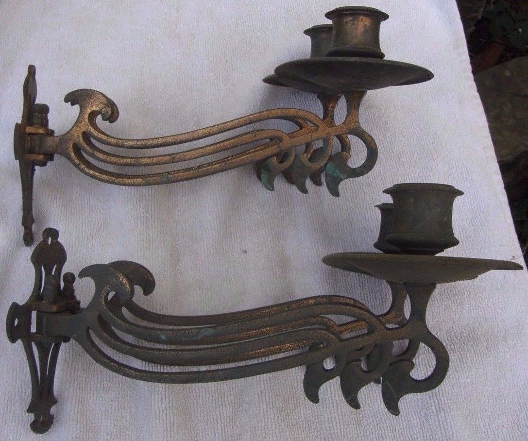 Antique Pair of Brass Piano Wall Scones Candle Holder