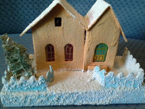 Title (ebay affiliate link): Vintage Japan Cardboard Paper Christmas Village Putz House w Fence Tree