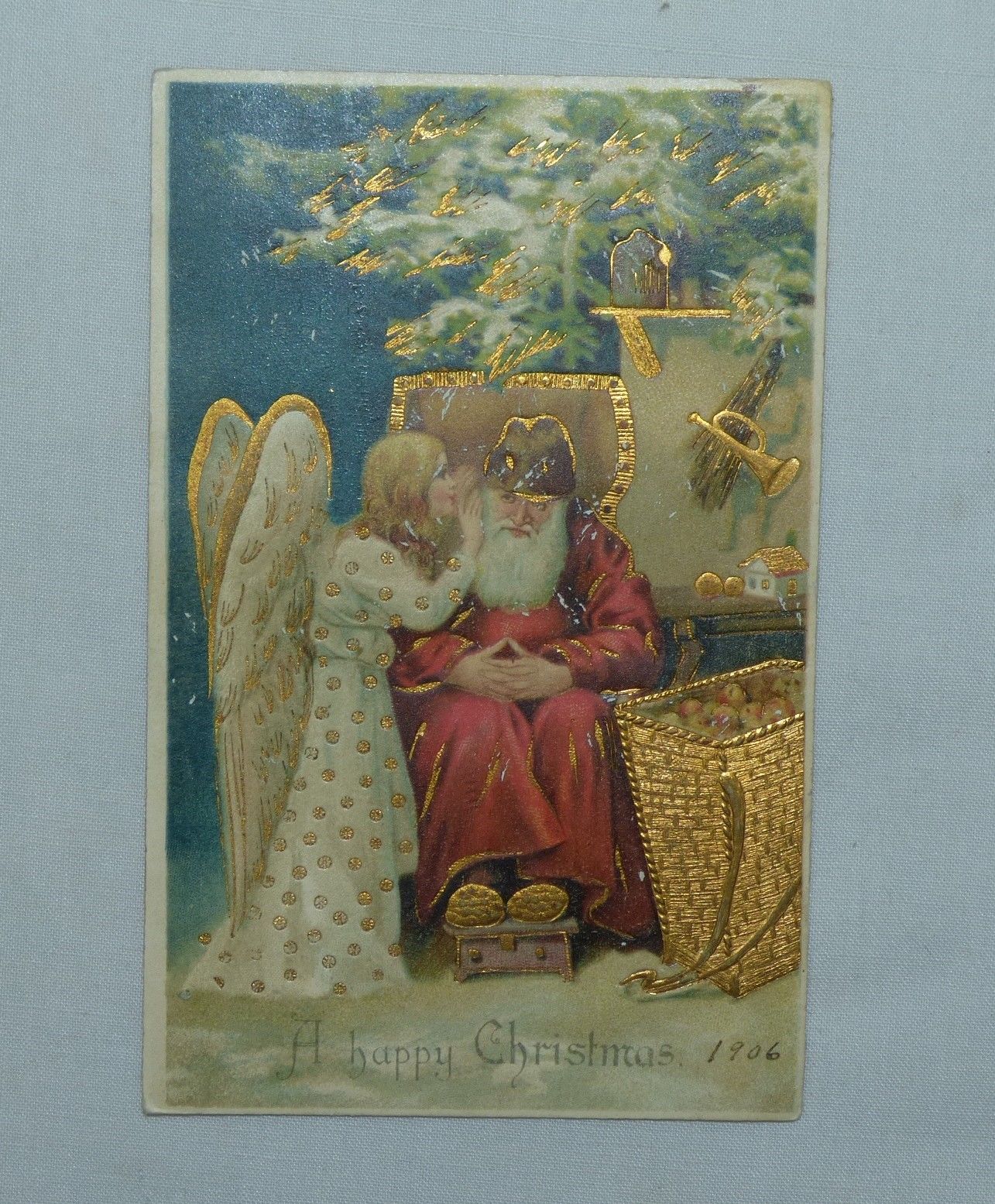 Title (ebay affiliate link): Antique 1906 Christmas Postcard Santa Claus & Angel w/ Gold Printed in Germany