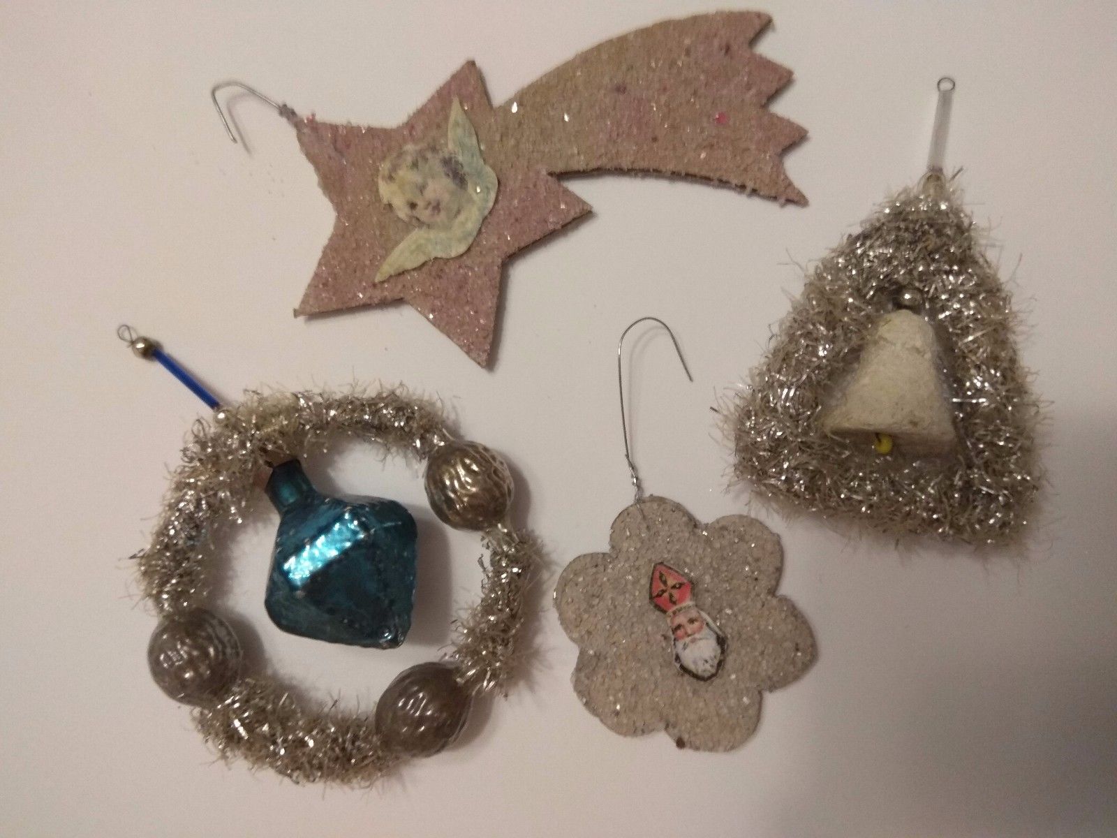 Title (ebay affiliate link): MIX OF 4 TINSEL AND PAPIER ANTIQUE CHRISTMAS ORNAMENTS