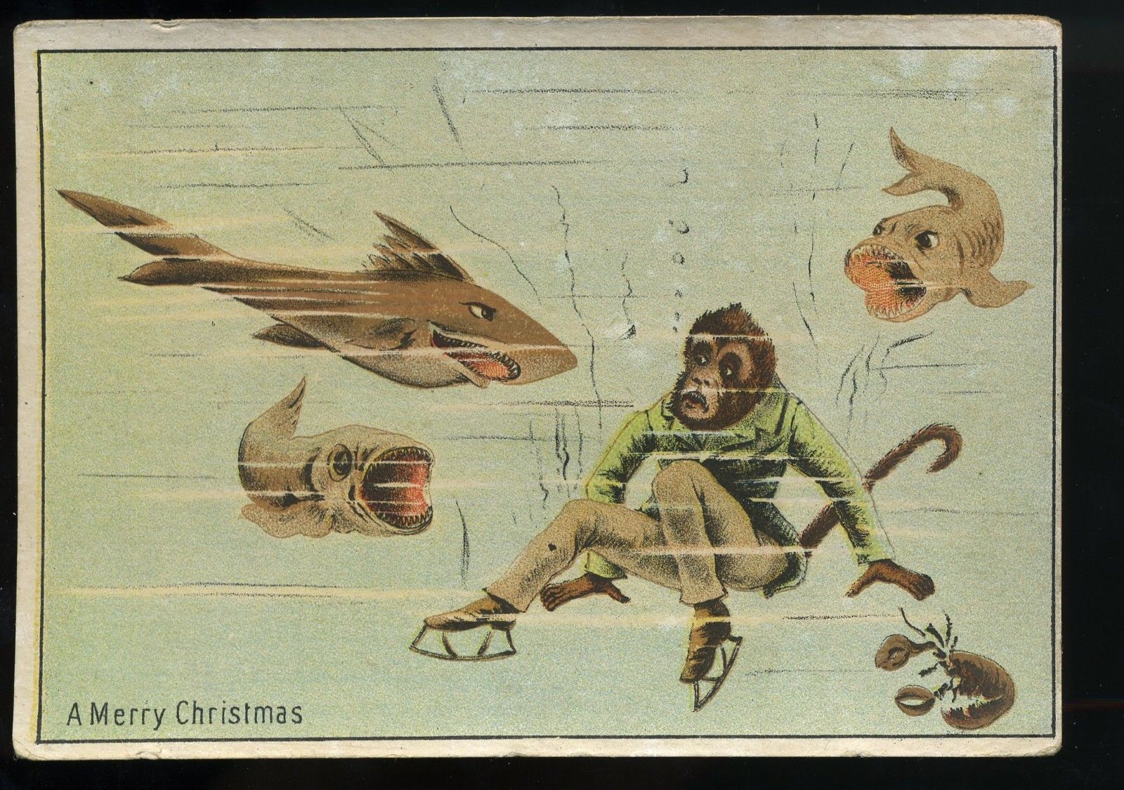 VICTORIAN DRESSED MONKEY CHRISTMAS ICE SKATER FALLS THRU ICE, LAUGHING SHARK
