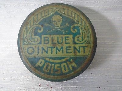 Title (ebay affiliate link): Vintage BLUE OINTMENT Tin Poison Skull Crossbones Cure All Quack Medicine