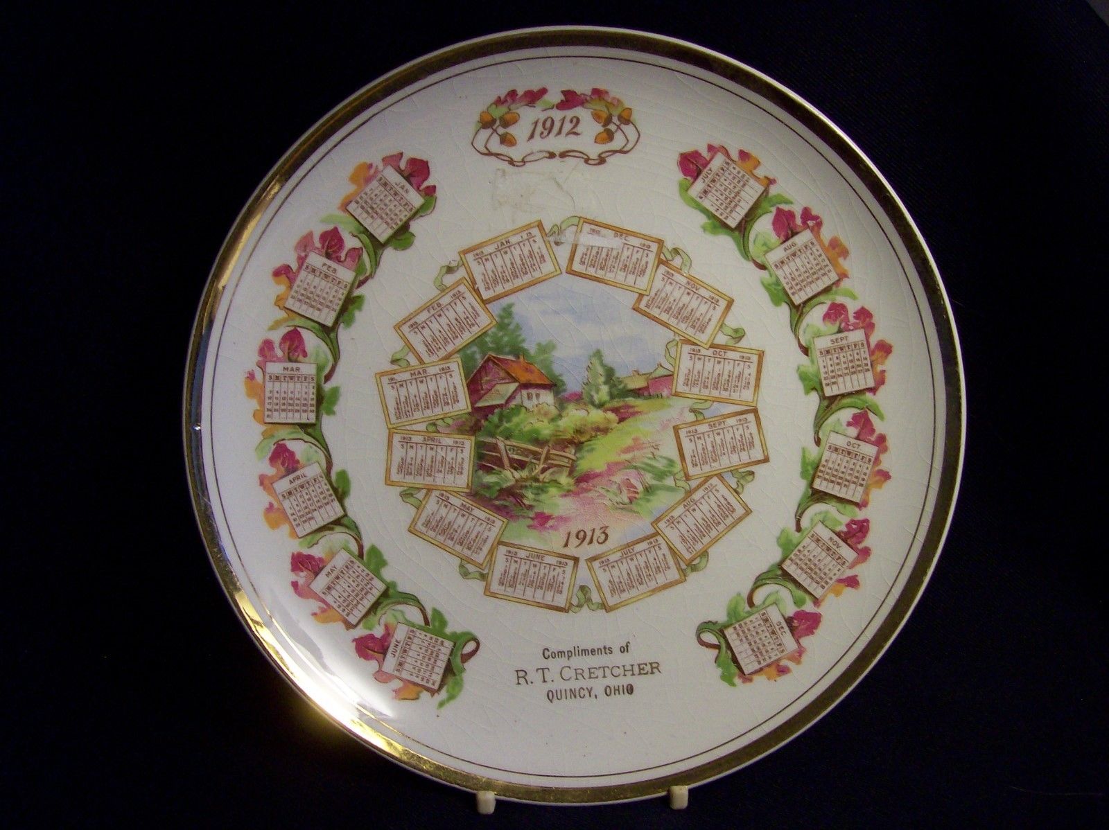 1912 CALENDAR PLATE Quincy, Ohio Dresden China