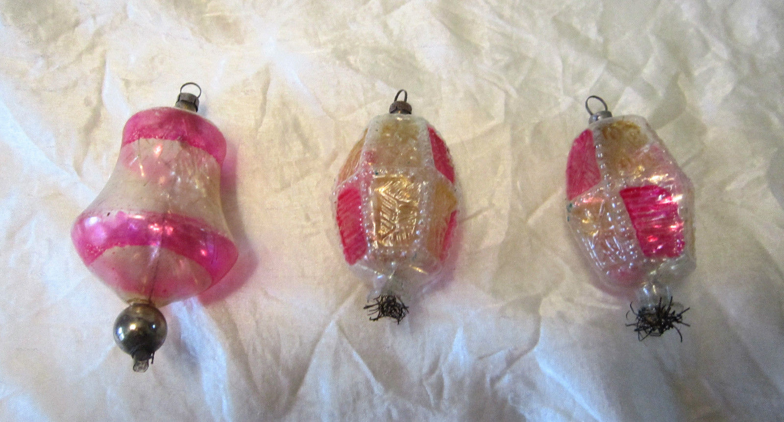 3 Vintage Unsilvered Pink Glass WWII Era Christmas Ornaments Tinsel Inside lot
