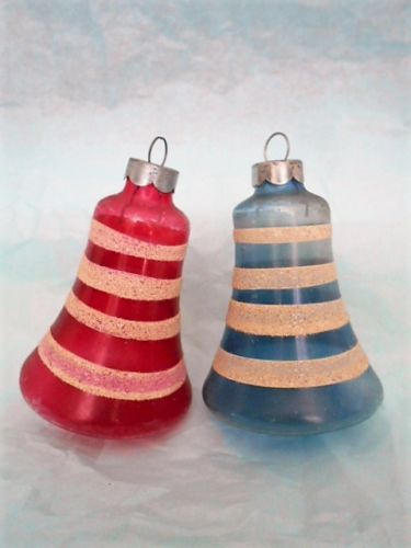 Title (ebay affiliate link): 2 VINTAGE UNSILVERED MICA STRIPED GLASS BELL SHAPED ORNAMENTS 1 RED, 1 BLUE
