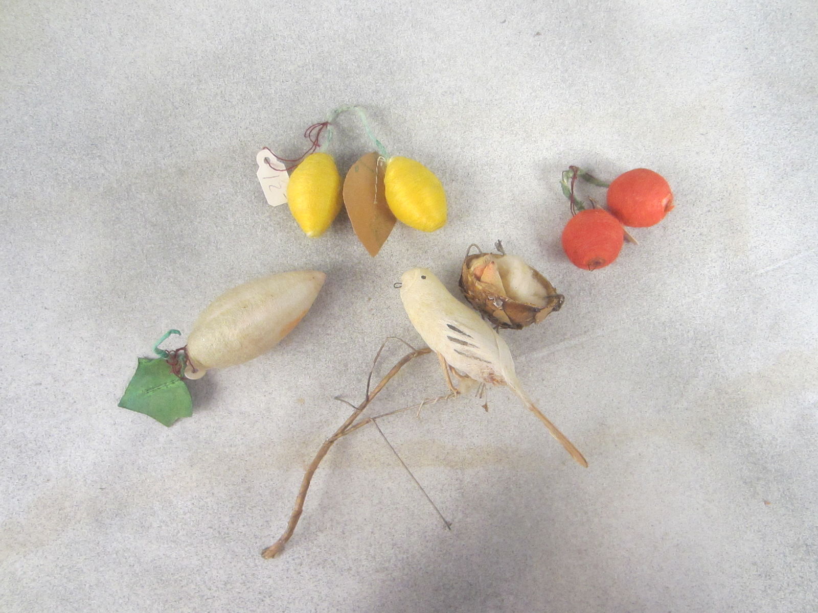 Title (ebay affiliate link): Christmas Cotton Ornaments Bird and Nest Cherries Lemons Squash 1930s