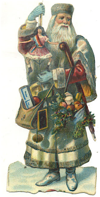 Title (ebay affiliate link): 1880s Color Lithographed Die-Cut SANTA CLAUS White Coat With Many Toys