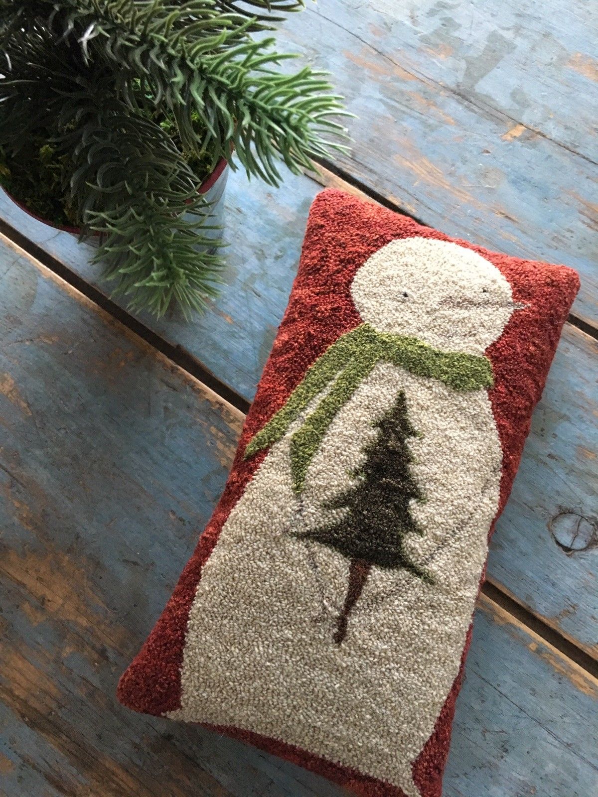 Title (ebay affiliate link): PRIMITIVE FOLK ART HAND MADE PUNCH NEEDLE PILLOW - **SNOWMAN WITH TREE**