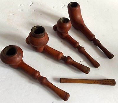 Title (ebay affiliate link): c1800''s Lot of Four Hand Carved Apple Wood Pipes and Holder