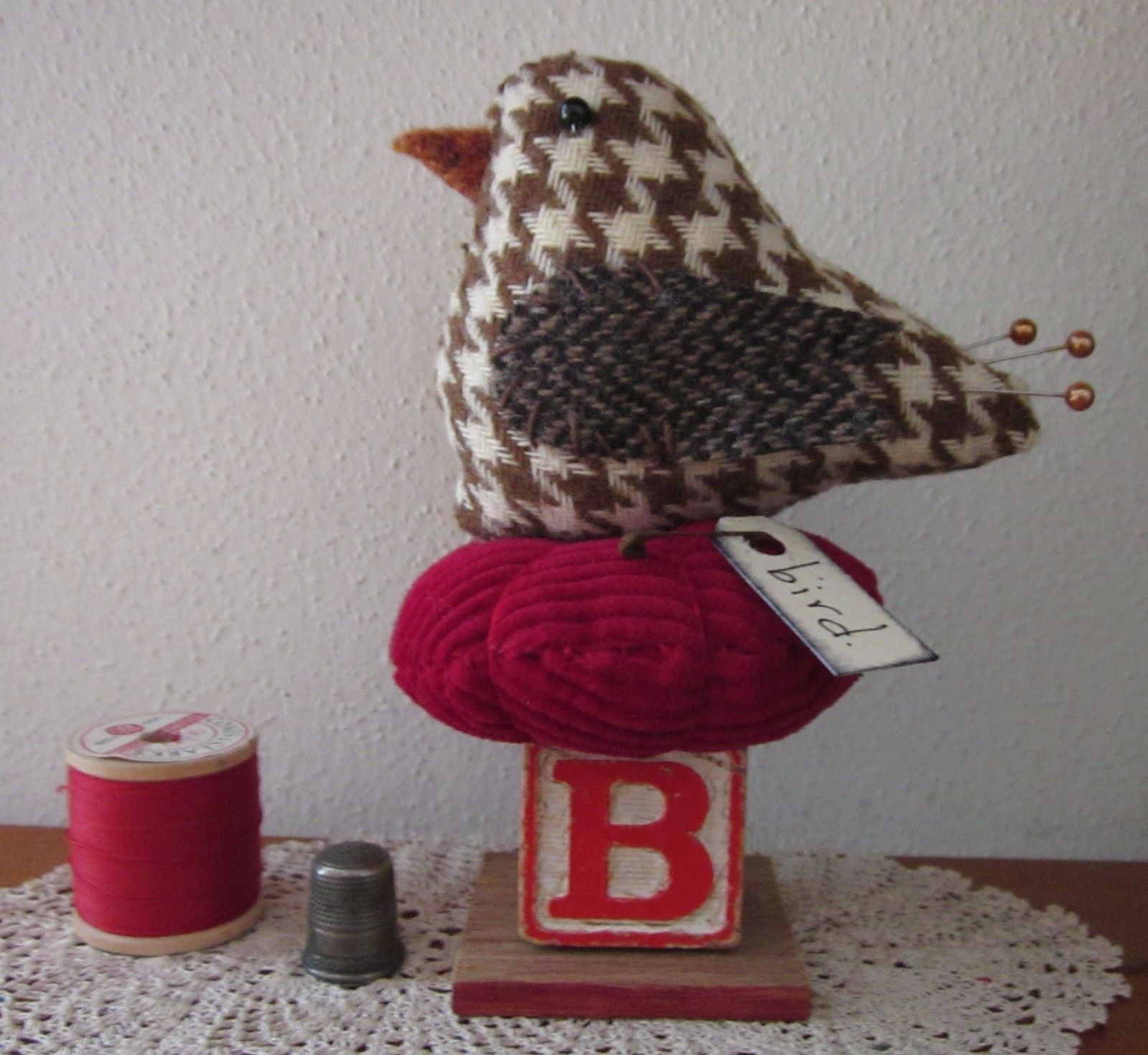 PRIMITIVE WOOL BIRD VINTAGE SPOOL THIMBLE TOY BLOCK MAKE DO PIN CUSHION PFATT