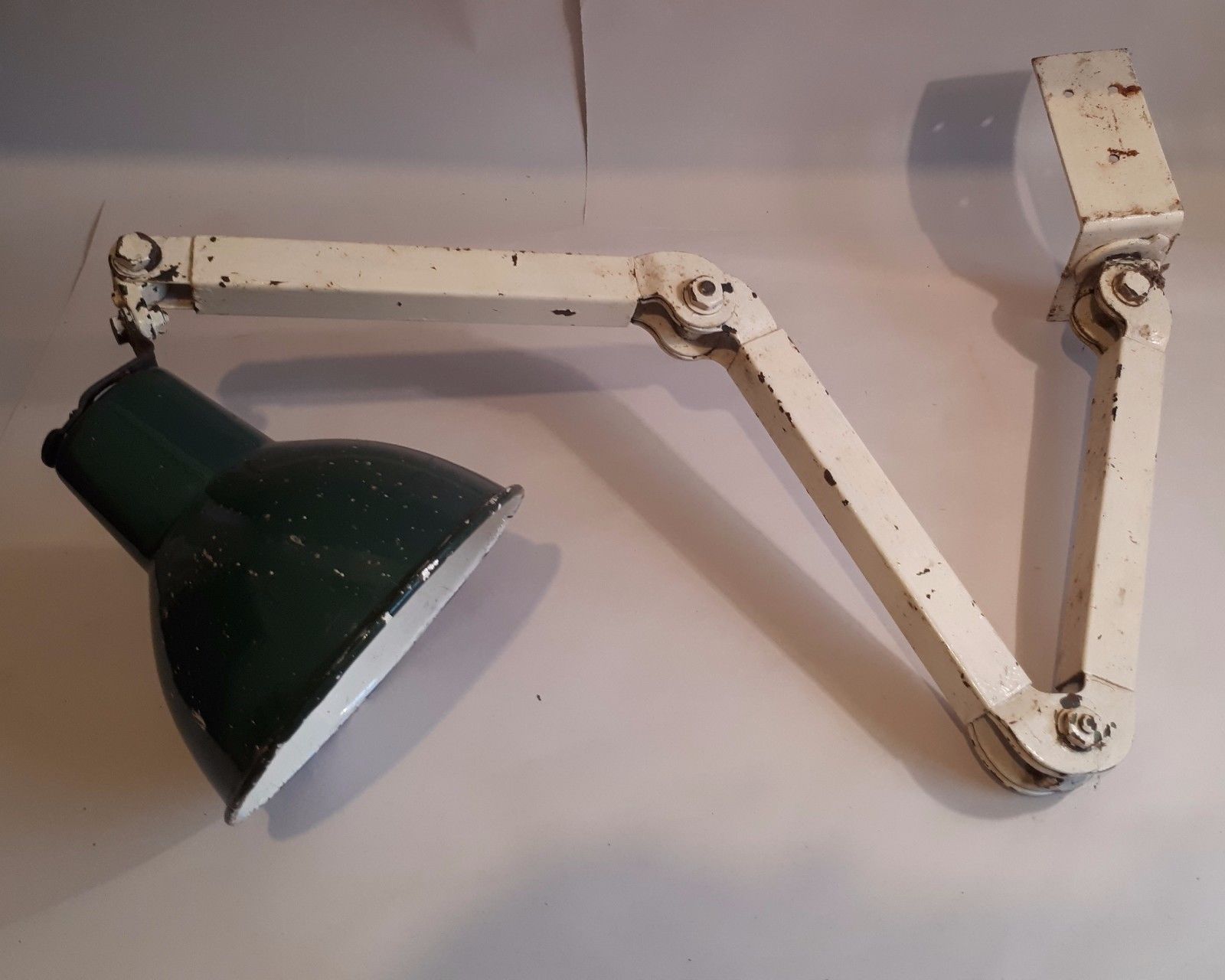 Title (ebay affiliate link): 1940s Industrial Triple Articulating Metal Inspection Lamp. Bench/ Wall Mounted