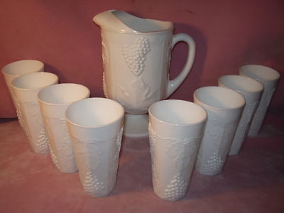 Indiana Harvest Grape Milk Glass Pitcher & 8 Glasses