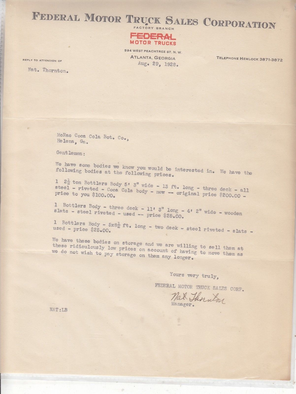 FEDERAL MOTOR TRUCK SALES CORPORATION LETTERHEAD DATED AUG. 29, 1928