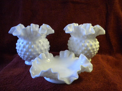 Lot of 3 Fenton Milk Glass Ruffled Edge Hobnail Pieces