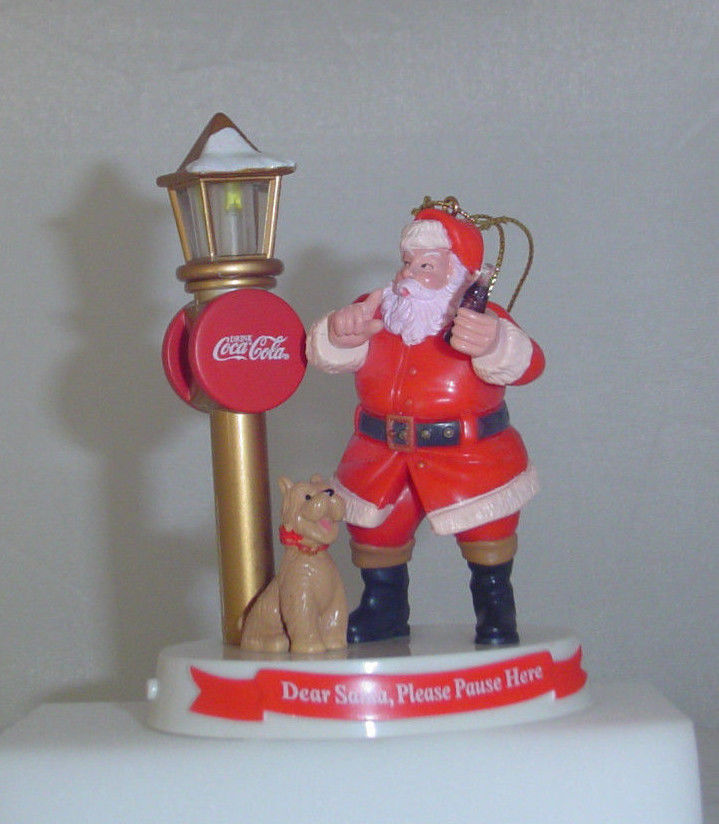 Title (ebay affiliate link): Christmas Ornament Coca Cola Coke Musical Santa w dog ornament lights up